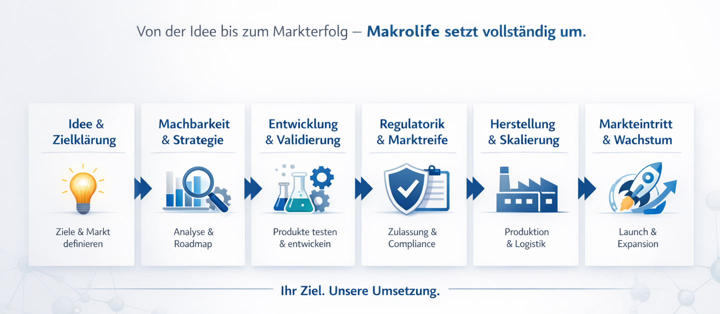 dall'idea al successo di mercato scalabile – strutturato, conforme alle normative e orientato a livello internazionale. A differenza della consulenza tradizionale, il nostro lavoro non si limita a concetti o presentazioni. Makrolife Biotech si occupa di